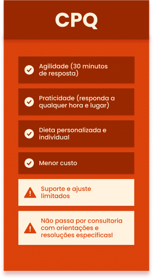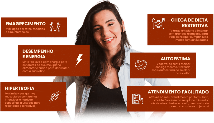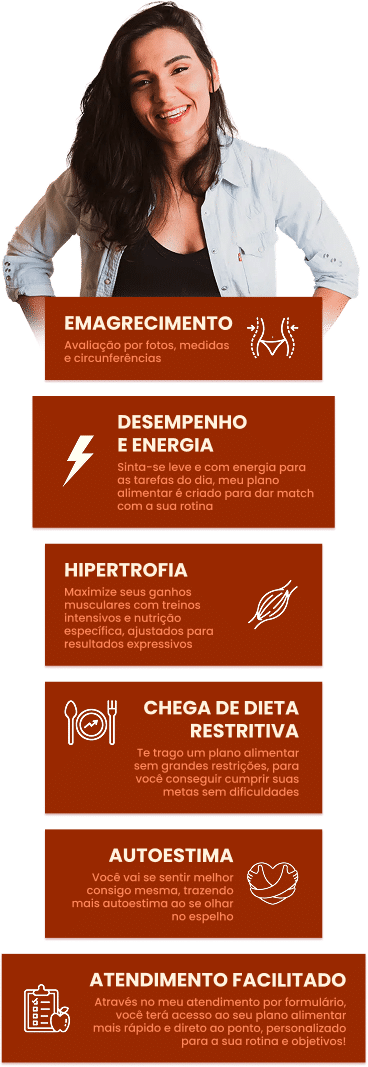 Tenha o suporte de uma nutricionista com consulta por formulário, plano alimentar personalizado para suas necessidades e acompanhamento ilimitado via WhatsApp!